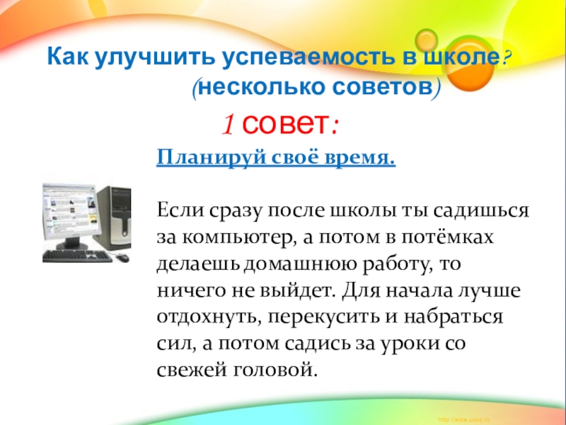 Если сразу после школы ты садишься за компьютер, а потом в потёмках делаешь домашнюю работу, то ничего не выйдет. Для начала лучше отдохнуть, перекусить и набраться сил, а потом садись за уроки со свежей головой.