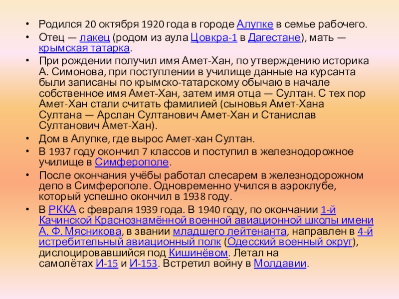 При рождении получил имя Амет-Хан, по утверждению историка А. Симонова, при поступлении в училище данные на курсанта были записаны по крымско-татарскому обычаю в начале собственное имя Амет-Хан, затем имя отца — Султан. С тех пор Амет-Хан стали считать фамилией (сыновья Амет-Хана Султана — Арслан Султанович Амет-Хан и Станислав Султанович Амет-Хан).