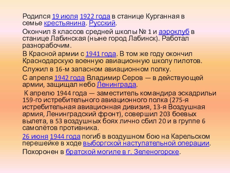 Слайд 6Родился 19 июля 1922 года в станице Курганная в семье крестьянина. Русский.