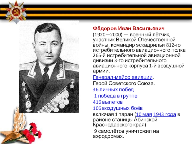 Командир эскадрильи 812-го истребительного авиационного полка 265-й истребительной авиационной дивизии 3-го истребительного авиационного корпуса 1-й воздушной армии старший лейтенант Федоров 26 октября 1944 года Указом Президиума Верховного Совета СССР удостоен звания Герой Советского Союза. Золотая Звезда № 4506