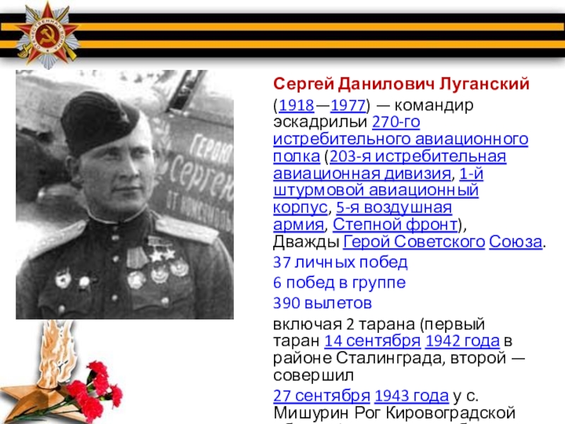 превосходящих сил противника, прикрывая переправу через Волгу для 13-й гвардейской стрелковой дивизии. Он пошёл на сближение с ведущим группы Me-109. Немец пытался уйти от столкновения, но Луганский ударом винта снёс стабилизатор «мессершмитта», и вражеский самолёт потерял управление и пошёл к земле. В дальнейшем капитан Луганский пересел на самолёт Як-1Б на Курской дуге и под Харьковом.
