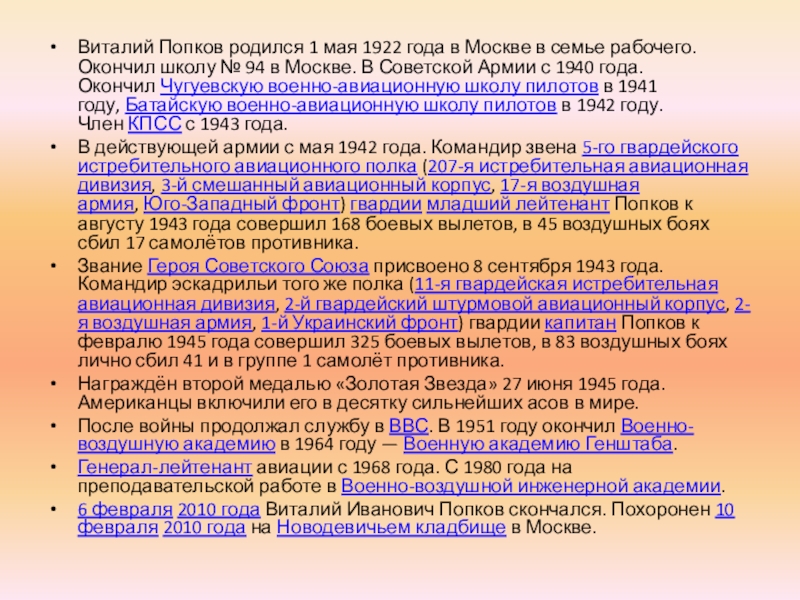Слайд 4Виталий Попков родился 1 мая 1922 года в Москве в семье