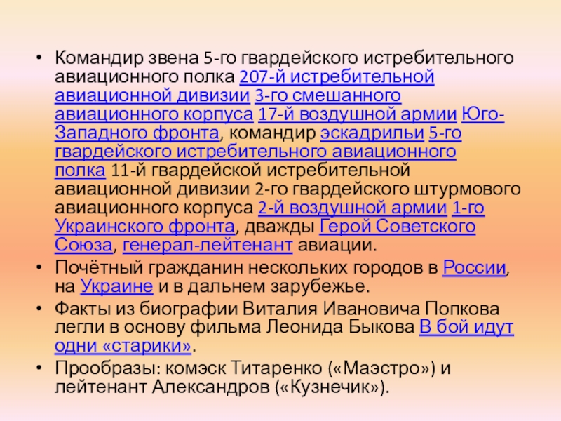 Факты из биографии Виталия Ивановича Попкова легли в основу фильма Леонида Быкова В бой идут одни «старики».
