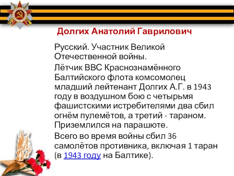 комсомолец младший лейтенант Долгих А.Г. в 1943 году в воздушном бою с четырьмя фашистскими истребителями два сбил огнём пулемётов, а третий - тараном. Приземлился на парашюте.