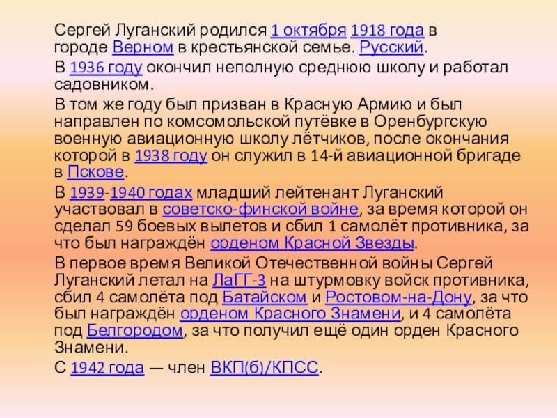 Слайд 8Сергей Луганский родился 1 октября 1918 года в городе Верном в крестьянской семье. Русский.