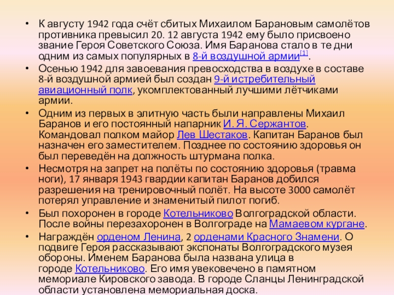 20. 12 августа 1942 ему было присвоено звание Героя Советского Союза. Имя Баранова стало в те дни одним из самых популярных в 8-й воздушной армии[1].