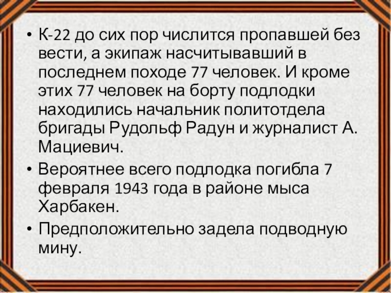 Слайд 14К-22 до сих пор числится пропавшей без вести, а экипаж насчитывавший