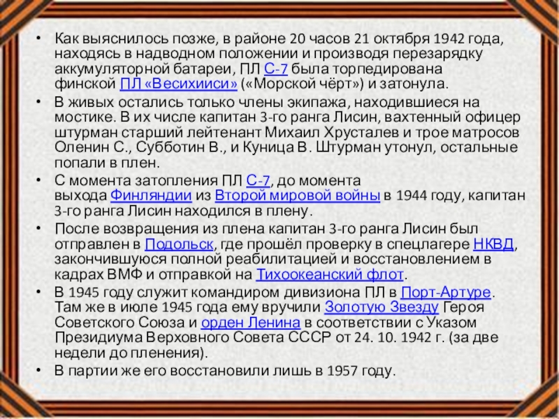 С момента затопления ПЛ С-7, до момента выхода Финляндии из Второй мировой войны в 1944 году, капитан 3-го ранга Лисин находился в плену.