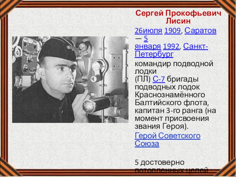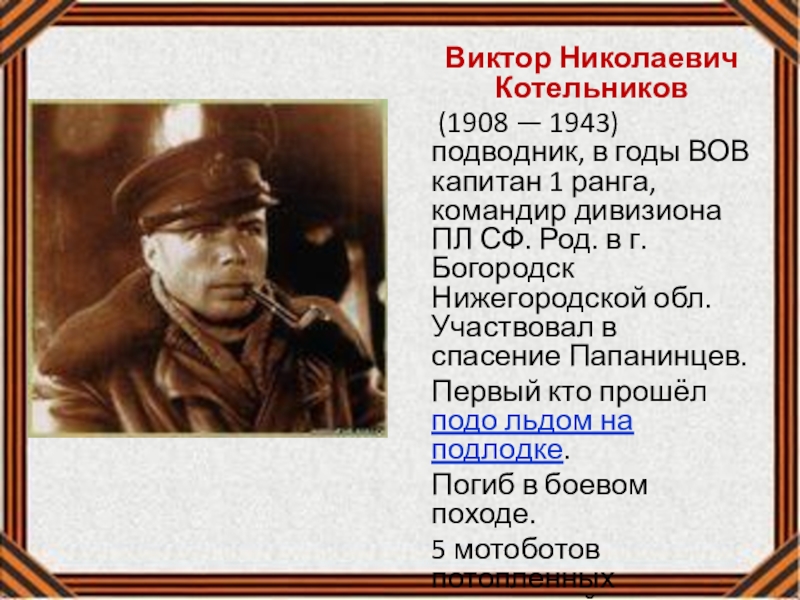 ранга, командир дивизиона ПЛ СФ. Род. в г. Богородск Нижегородской обл. Участвовал в спасение Папанинцев.
