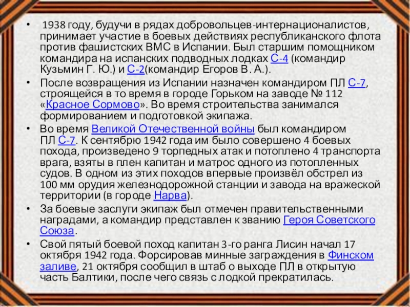 республиканского флота против фашистских ВМС в Испании. Был старшим помощником командира на испанских подводных лодках С-4 (командир Кузьмин Г. Ю.) и С-2(командир Егоров В. А.).