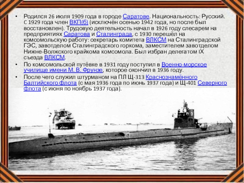 Слайд 6Родился 26 июля 1909 года в городе Саратове. Национальность: Русский. C 1929