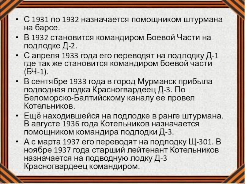 Слайд 12С 1931 по 1932 назначается помощником штурмана на барсе.