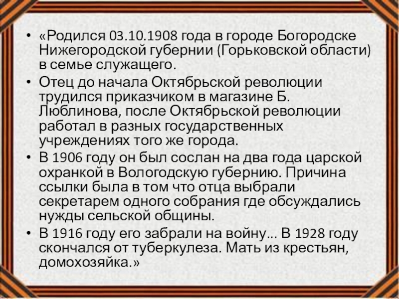 Слайд 11«Родился 03.10.1908 года в городе Богородске Нижегородской губернии (Горьковской области) в
