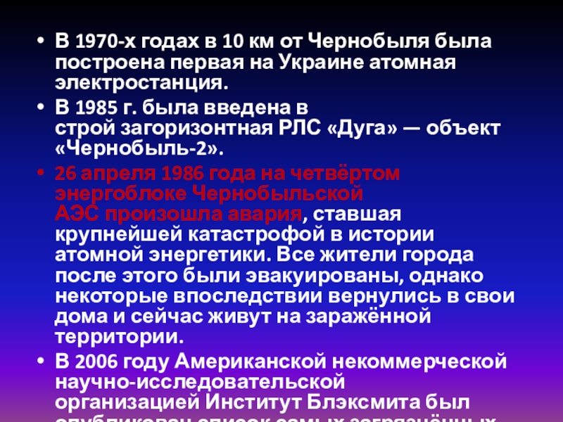 В 1970-х годах в 10 км от Чернобыля была построена первая на Украине атомная электростанция.В 1985 г. была введена в строй загоризонтная РЛС