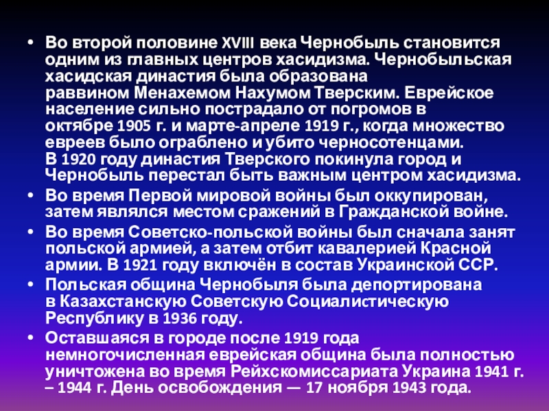 Слайд 5Во второй половине XVIII века Чернобыль становится одним из главных центров хасидизма. Чернобыльская хасидская