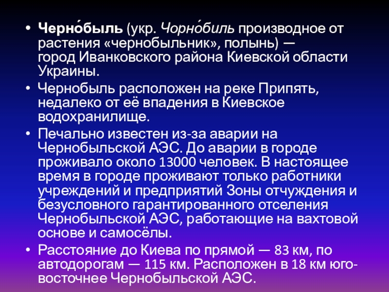 Слайд 2Черно́быль (укр. Чорно́биль производное от растения «чернобыльник», полынь) — город Иванковского района Киевской области Украины.