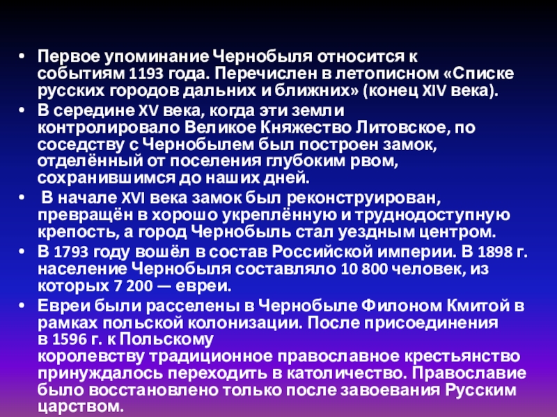 Слайд 4Первое упоминание Чернобыля относится к событиям 1193 года. Перечислен в летописном «Списке
