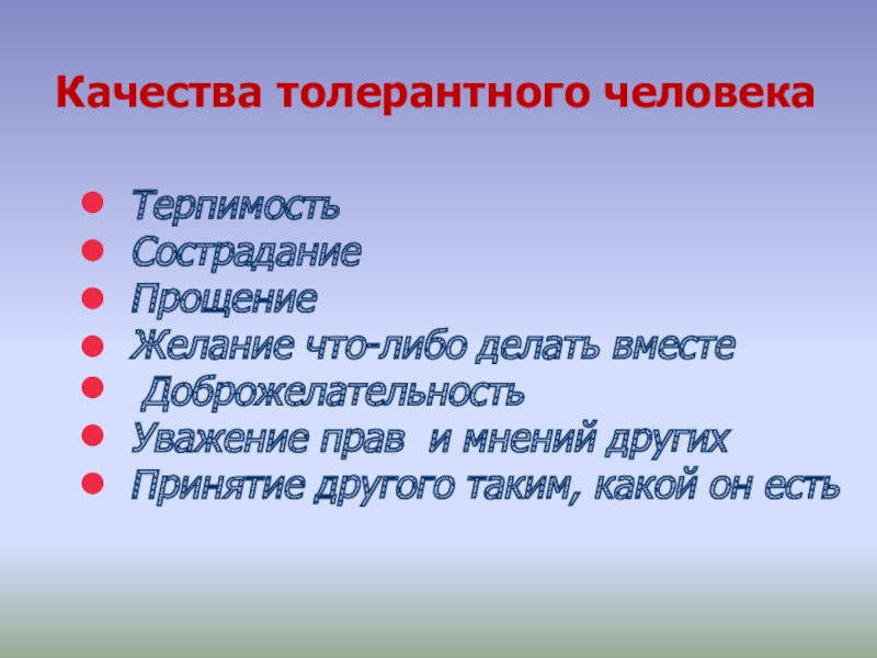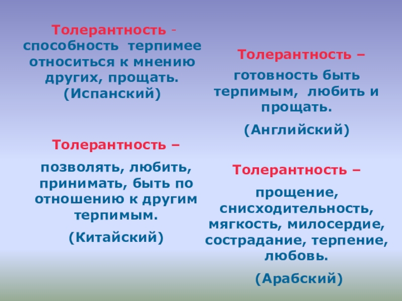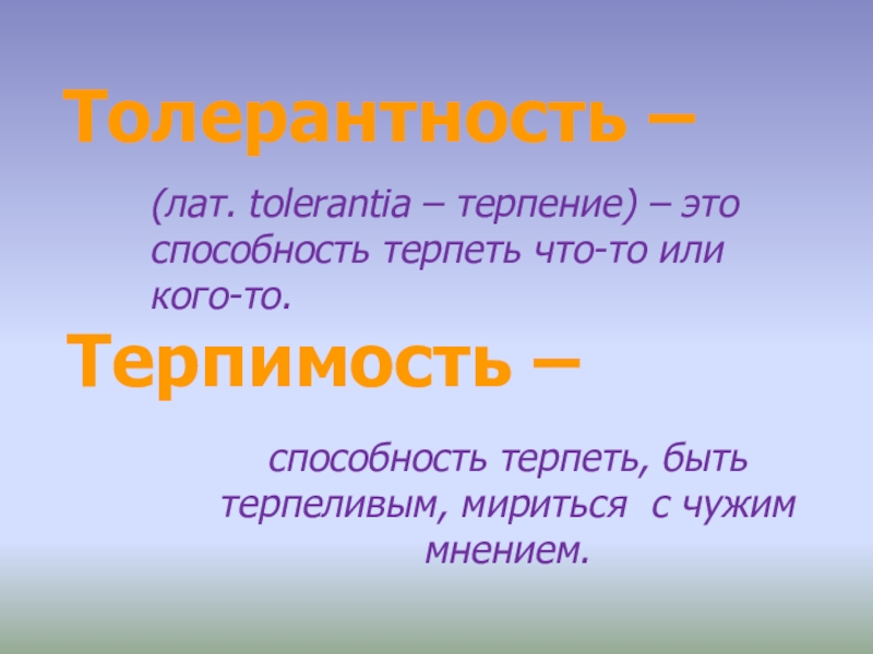 способность терпеть, быть терпеливым, мириться с чужим мнением.