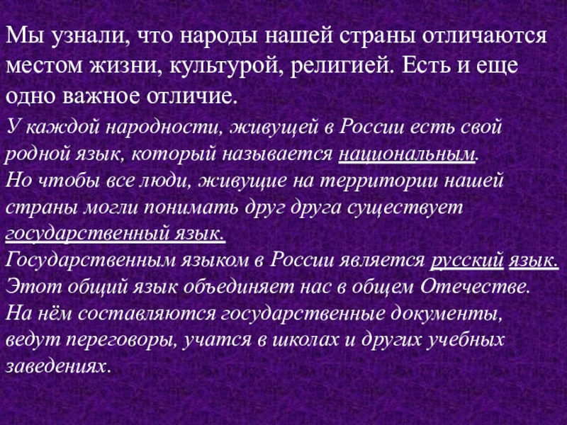 Но чтобы все люди, живущие на территории нашей страны могли понимать друг друга существует государственный язык.