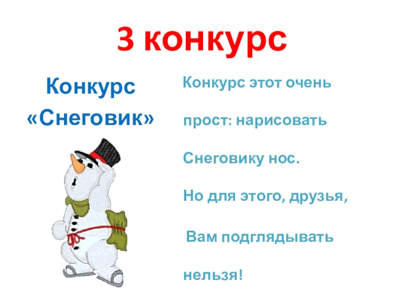 3 конкурсКонкурс «Снеговик»  Конкурс этот очень прост: нарисовать Снеговику нос.  Но для этого, друзья,