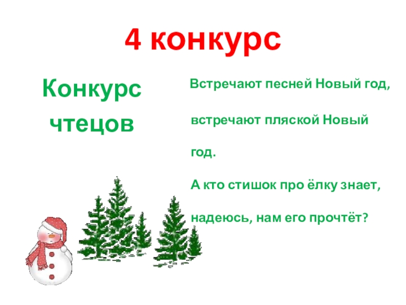 4 конкурсКонкурс чтецов  Встречают песней Новый год, встречают пляской Новый год.  А кто стишок про