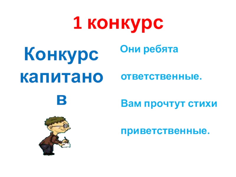 1 конкурс Конкурс капитанов Они ребята ответственные. Вам прочтут стихи приветственные.