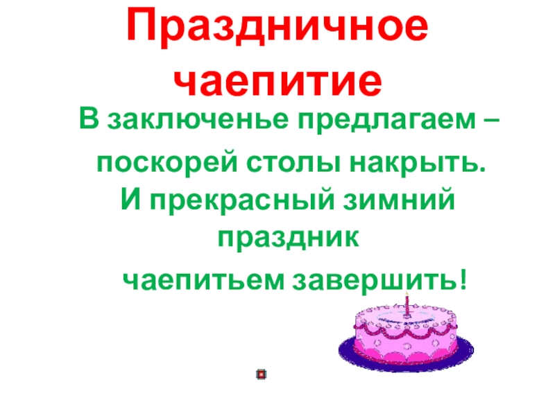 Праздничное чаепитие  В заключенье предлагаем –   поскорей столы накрыть. И прекрасный зимний праздник