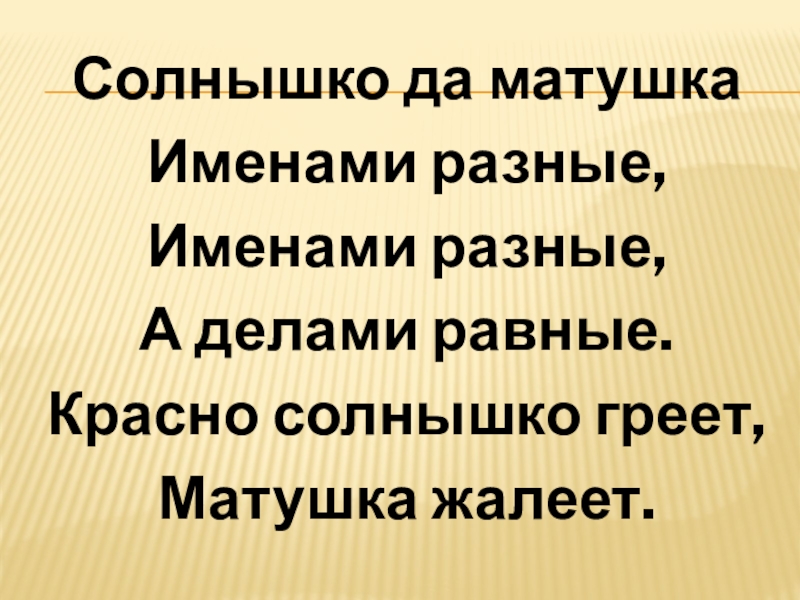 Солнышко да матушкаИменами разные,Именами разные,А делами равные.Красно солнышко греет, Матушка жалеет.