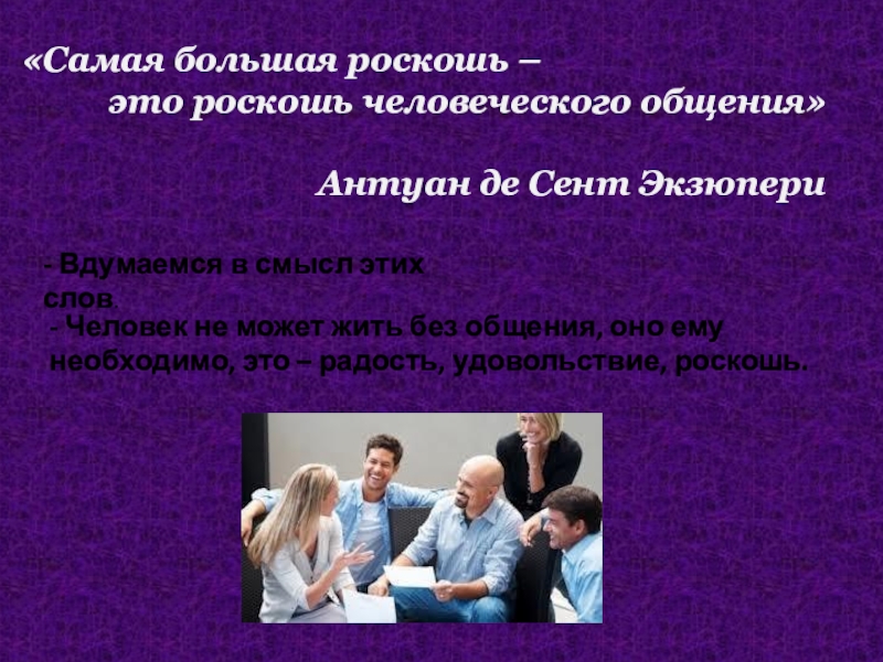 - Человек не может жить без общения, оно ему необходимо, это – радость, удовольствие, роскошь.