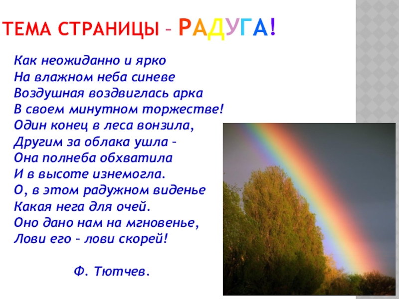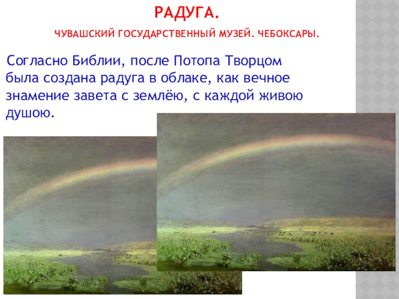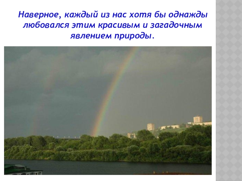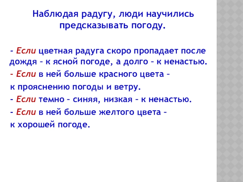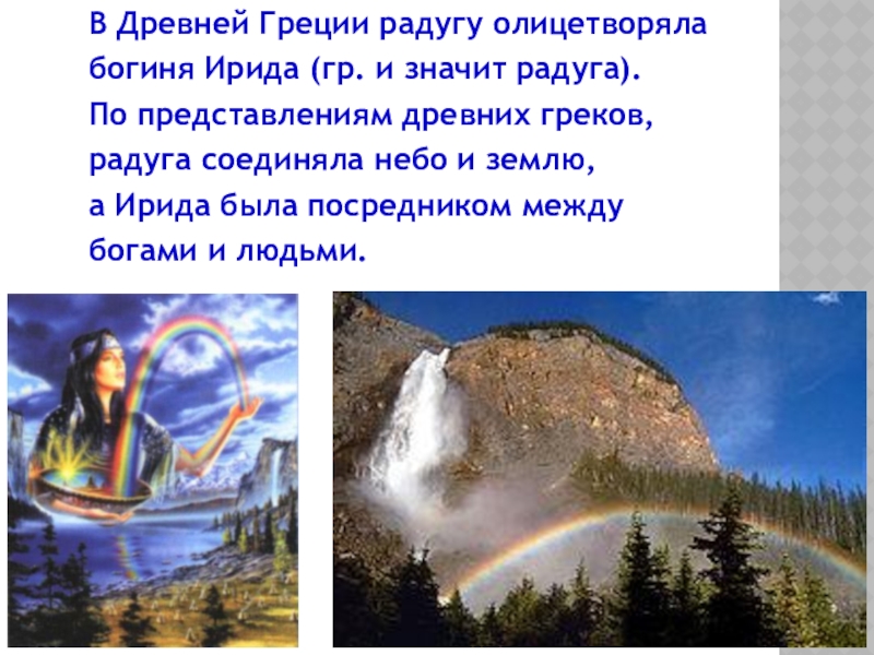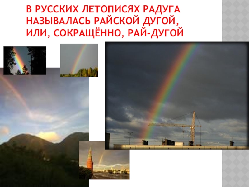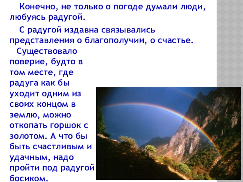 Существовало поверие, будто в том месте, где радуга как бы уходит одним из своих концом в землю, можно откопать горшок с золотом. А что бы быть счастливым и удачным, надо пройти под радугой босиком.