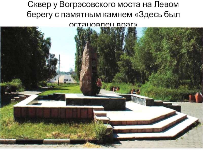 Слайд 9Сквер у Вогрэсовского моста на Левом берегу с памятным камнем «Здесь