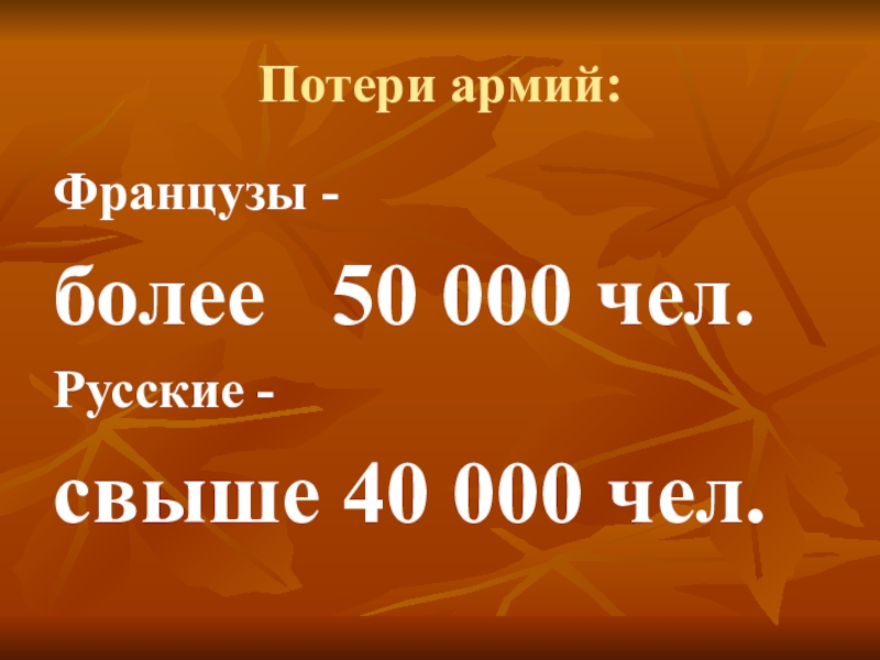 Потери армий:Французы -более  50 000 чел.Русские -свыше 40 000 чел.