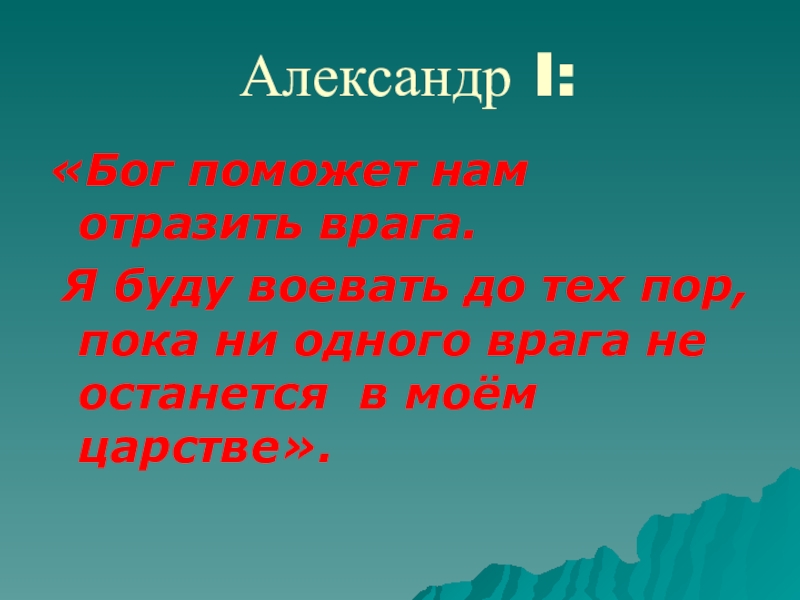 Александр I:«Бог поможет нам отразить врага. Я буду воевать до тех пор, пока ни одного врага не