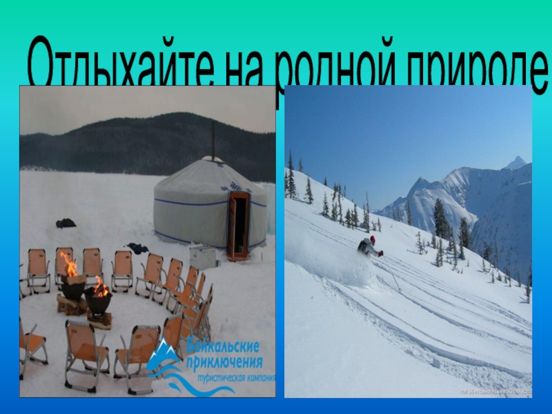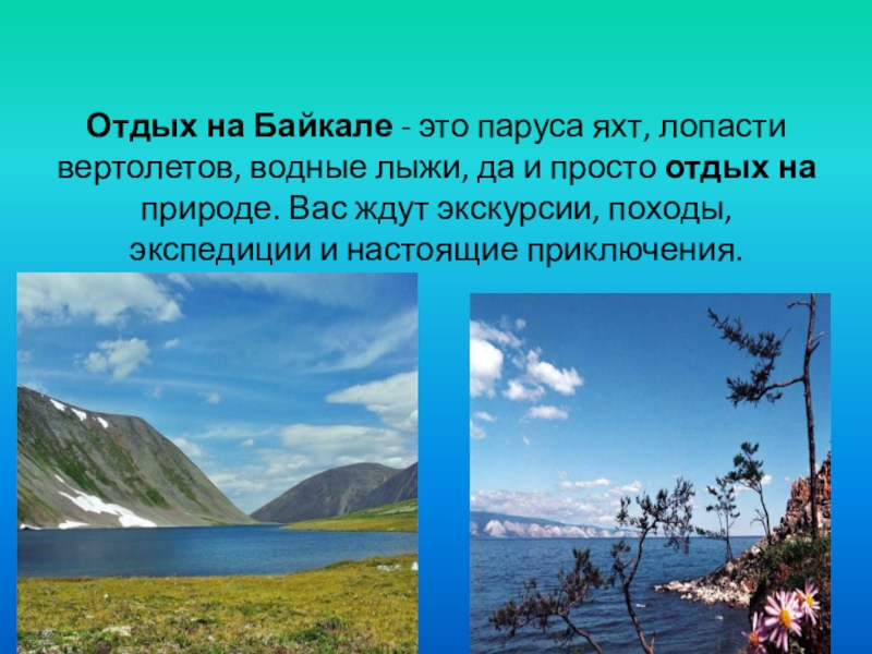 Слайд 11Отдых на Байкале - это паруса яхт, лопасти вертолетов, водные лыжи,