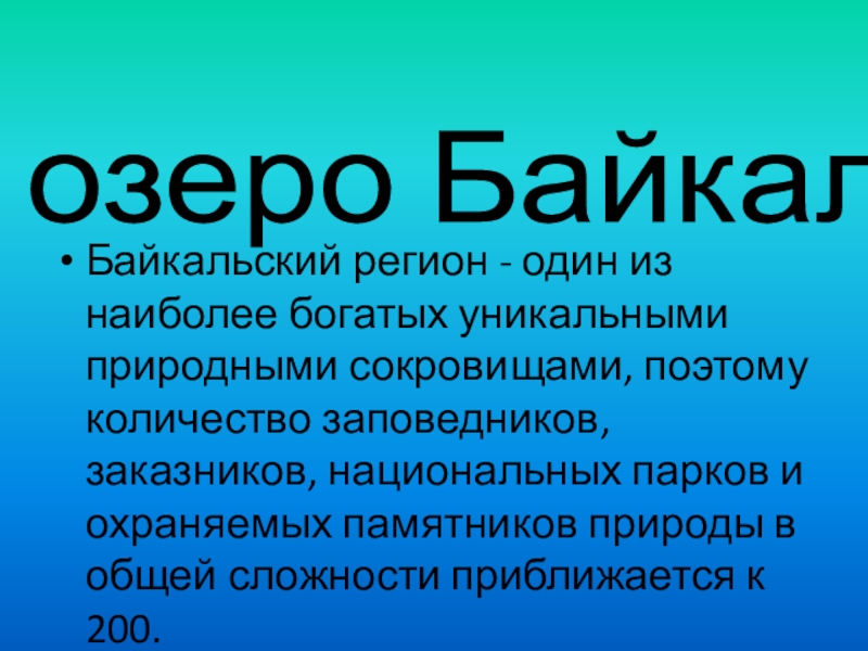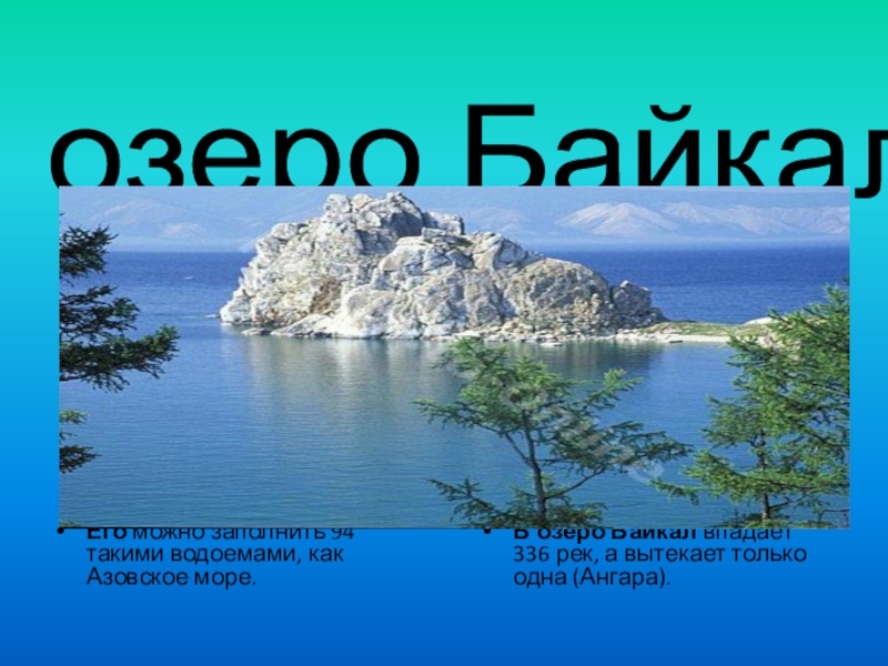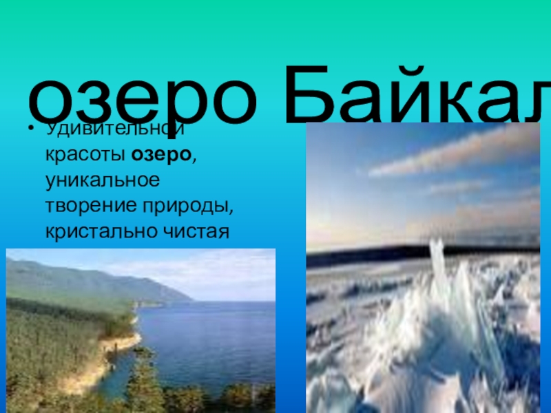 озеро БайкалУдивительной красоты озеро, уникальное творение природы, кристально чистая вода…