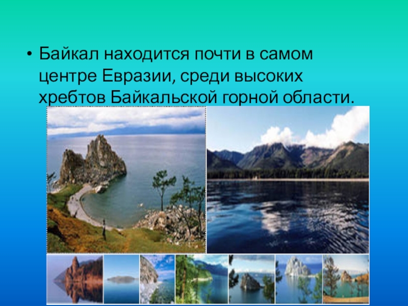 Слайд 6Байкал находится почти в самом центре Евразии, среди высоких хребтов Байкальской