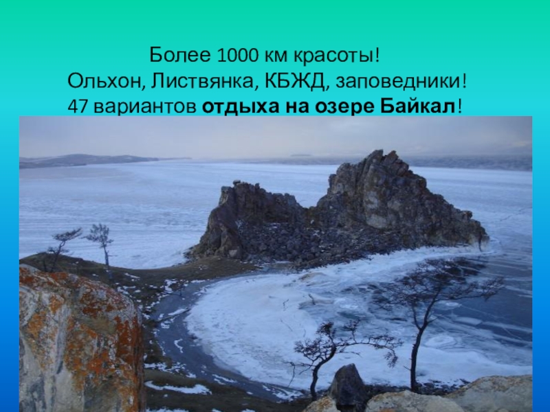 Слайд 12Более 1000 км красоты! Ольхон, Листвянка, КБЖД, заповедники! 47 вариантов отдыха на