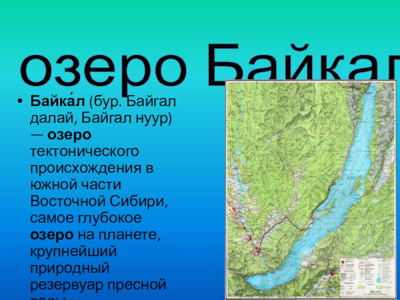 озеро БайкалБайка́л (бур. Байгал далай, Байгал нуур) — озеро тектонического происхождения в южной части Восточной Сибири, самое глубокое озеро на планете, крупнейший природный резервуар пресной воды
