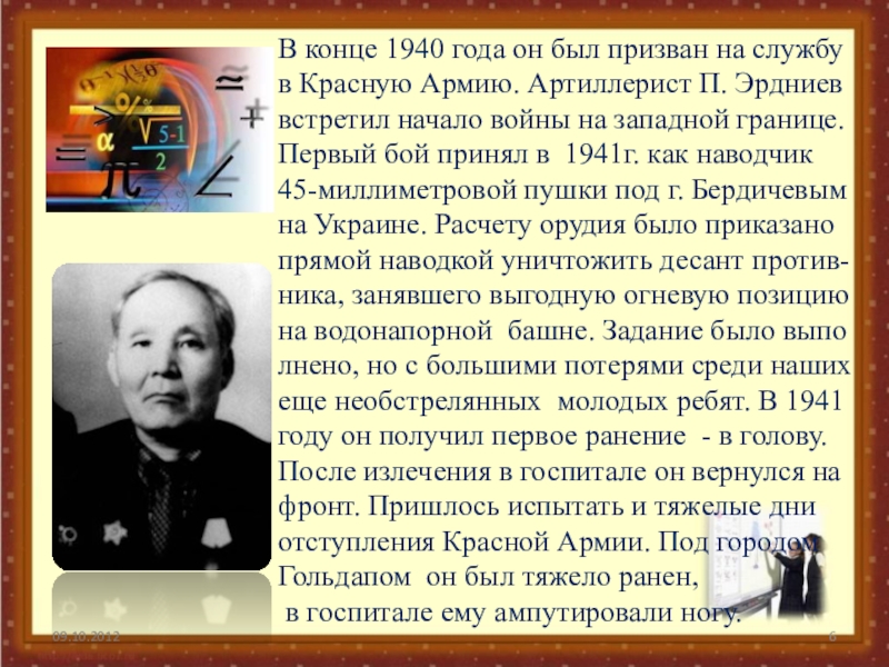 П. Эрдниева отмечен двумя боевыми орденами – Отечес-твенной войны первой и второй степени, многими медалями. Мужественный солдат разделил горестную судьбу своего народа. После демобилизации вместо родной Калмы кии П.М. Эрдниев вынужден был уехать на