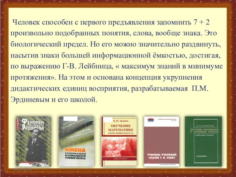 а именно, приращение информационного содержания. Идея укрупнения, естественно, заинтересовала не только математиков, но и физиков, химиков, биологов, лингвистов, представителей ряда других наук. Эта идея явилась основой докторской диссертации П.М. Эрдниева «Проблемы интенсификации обучения математике» (1973), многочисленных статей и книг, опубликованных в нашей стране и зарубежом ( Болгария, Венгрия, Германия, Монголия, Польша, Румыния, США, Фран ция , Япония).''