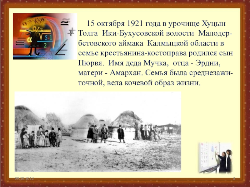 волости Малодер-бетовского аймака Калмыцкой области в семье крестьянина-костоправа родился сын Пюрвя. Имя деда Мучка, отца - Эрдни,