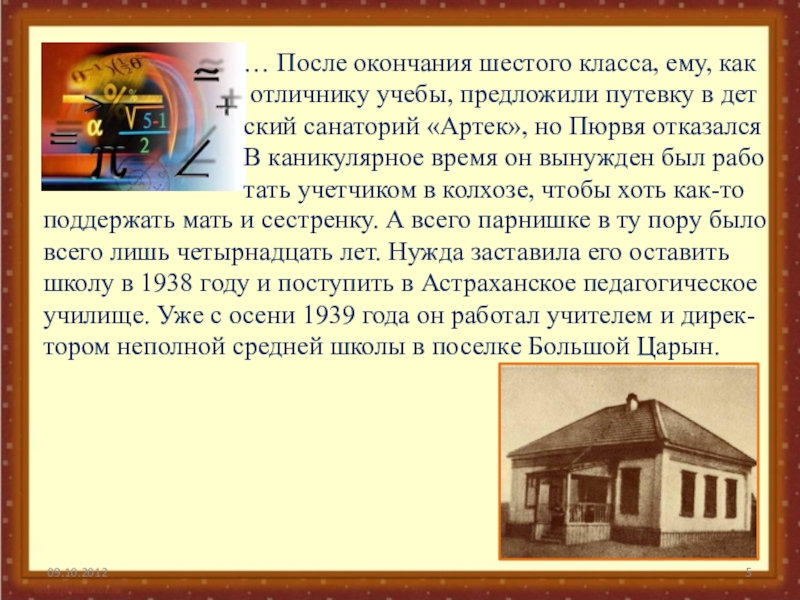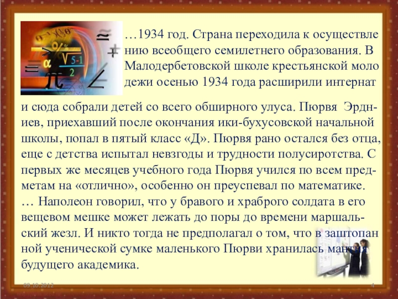 и сюда собрали детей со всего обширного улуса. Пюрвя Эрдн-иев, приехавший после окончания ики-бухусовской начальной школы, попал в пятый класс «Д». Пюрвя рано остался без отца, еще с детства испытал невзгоды и трудности полусиротства. С первых же месяцев учебного года Пюрвя учился по всем пред- метам на «отлично», особенно он преуспевал по математике.