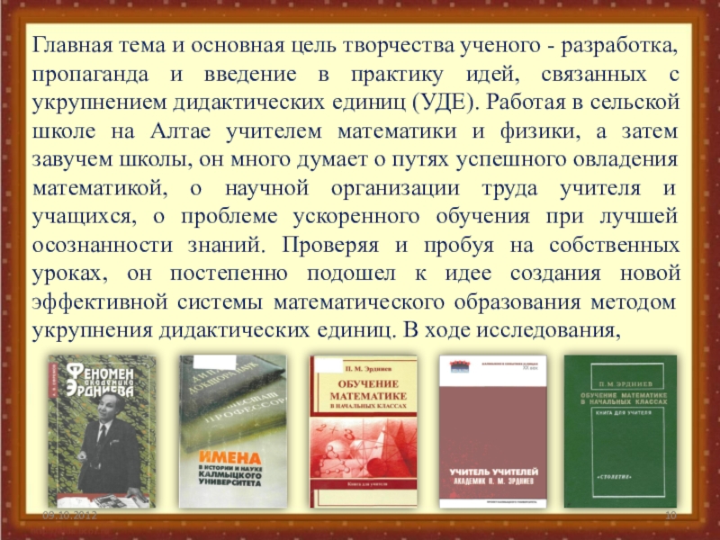 Слайд 10Главная тема и основная цель творчества ученого - разработка, пропаганда и