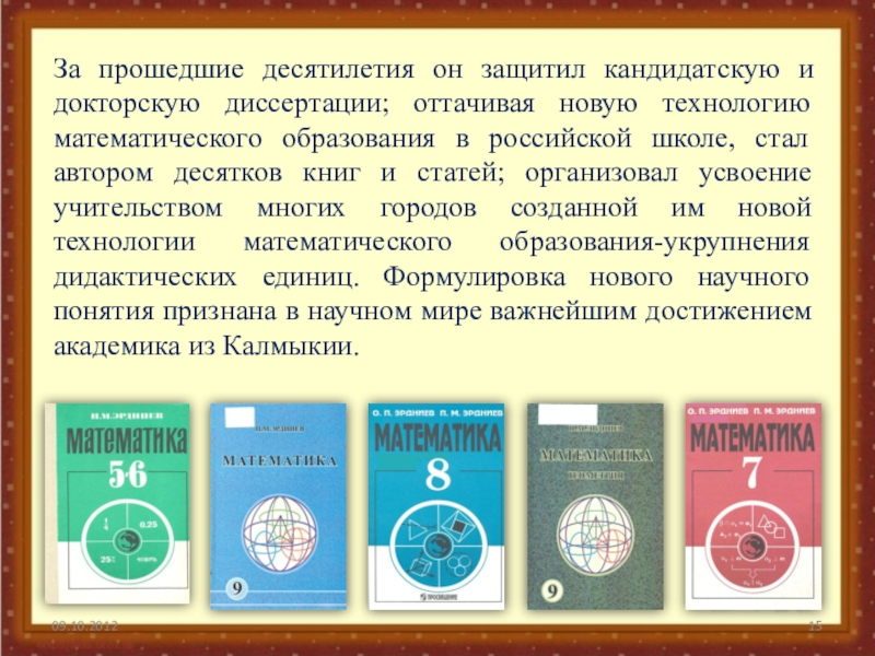 технологию математического образования в российской школе, стал автором десятков книг и статей; организовал усвоение учительством многих городов созданной им новой технологии математического образования-укрупнения дидактических единиц. Формулировка нового научного понятия признана в научном мире важнейшим достижением академика из Калмыкии.