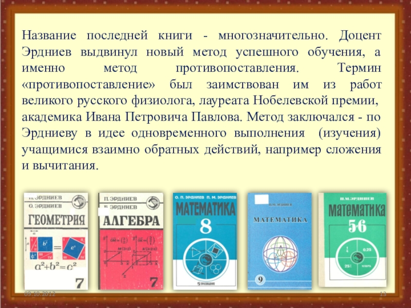Слайд 13Название последней книги - многозначительно. Доцент Эрдниев выдвинул новый метод успешного