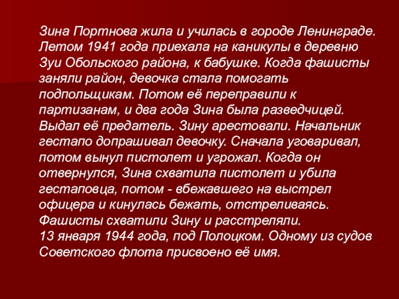 Слайд 11Зина Портнова жила и училась в городе Ленинграде. Летом 1941 года