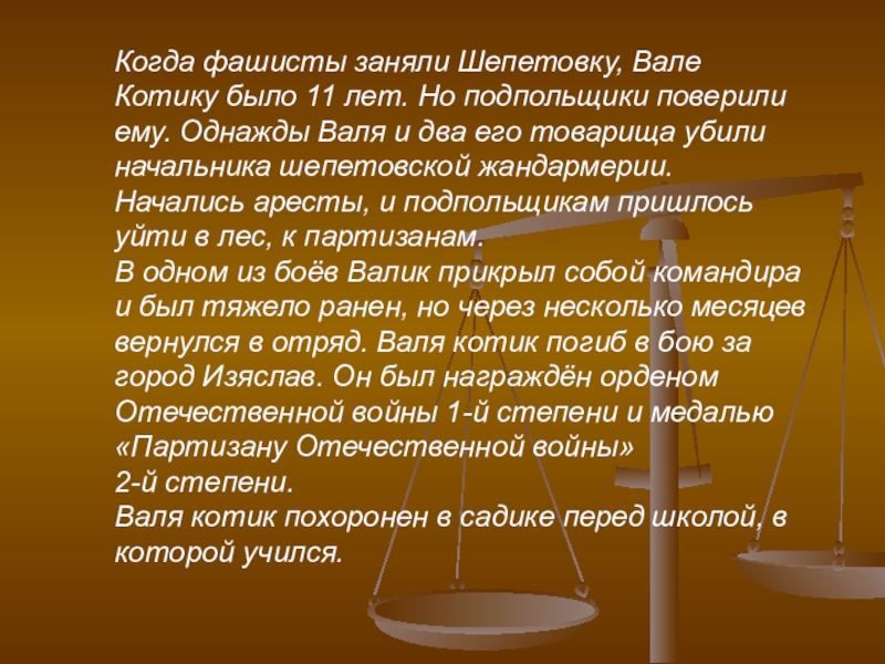 Слайд 9Когда фашисты заняли Шепетовку, Вале Котику было 11 лет. Но подпольщики