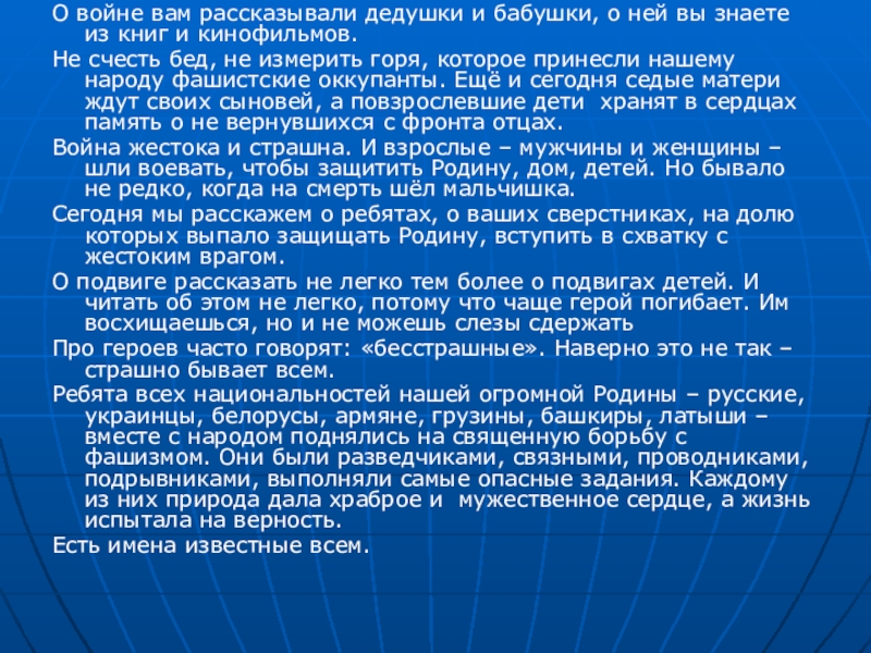 Ребята всех национальностей нашей огромной Родины – русские, украинцы, белорусы, армяне, грузины, башкиры, латыши – вместе с народом поднялись на священную борьбу с фашизмом. Они были разведчиками, связными, проводниками, подрывниками, выполняли самые опасные задания. Каждому из них природа дала храброе и мужественное сердце, а жизнь испытала на верность.