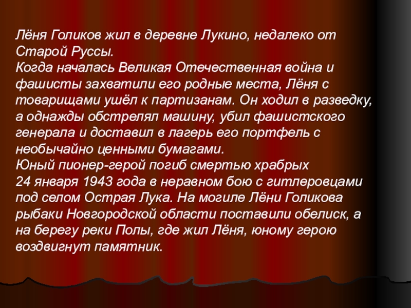 Слайд 5Лёня Голиков жил в деревне Лукино, недалеко от Старой Руссы.