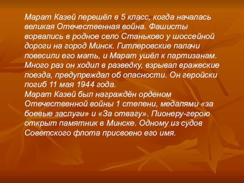 Слайд 7Марат Казей перешёл в 5 класс, когда началась великая Отечественная война.